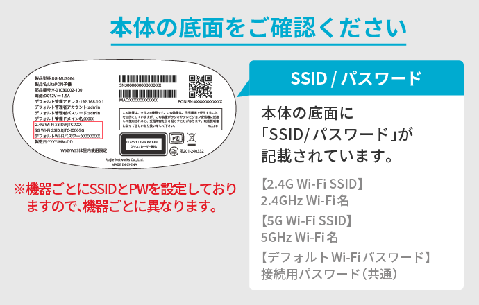 - 本器が部屋内に設置されている場合、機器側面に記載されているSSID/PWでWi-Fi接続がご利用いただけます。